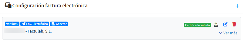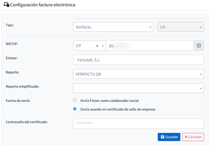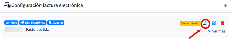 Completada la información necesaria, haz clic en Guardar. A continuación, debes subir el certificado (*) con el que se firmaran las facturas.