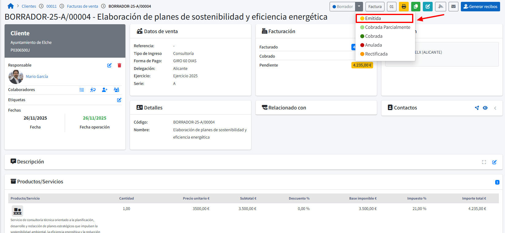 Al guardar la factura se crea en estado Borrador. Cuando estés seguro de que los datos son correctos, cambiarás la factura a estado Emitida.