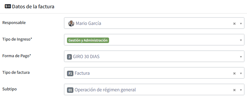- Responsable: Seleccionaremos el usuario responsable de la gestión de esta factura. Por defecto se colocará al creador de dicha factura.