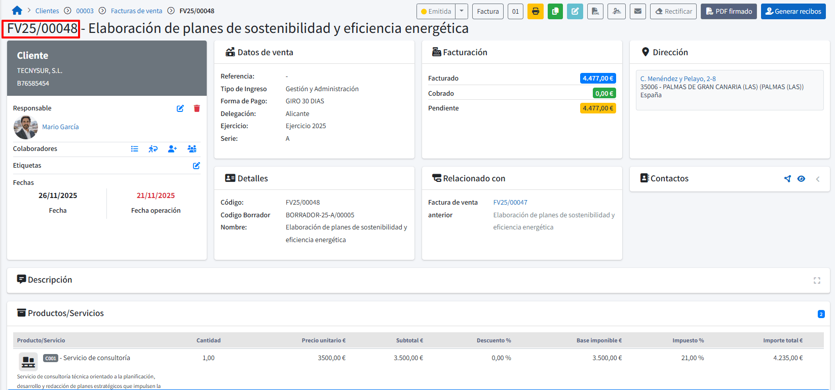 Cuando la factura se valida y se emite, Fixner asigna el código definitivo correspondiente a la serie y ejercicio seleccionados.