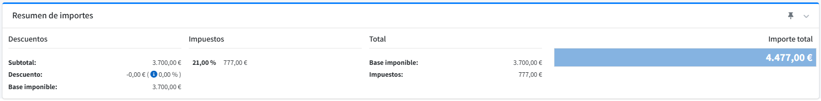 Se trata de un resumen de los importes de la factura creada, en el que puedes ver: el subtotal, los descuentos aplicados, la base imponible, los impuestos y el importe final.