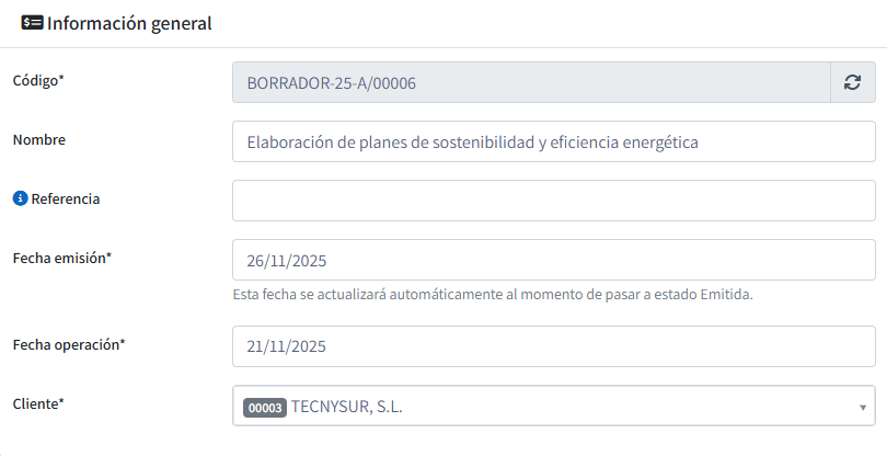 - Código (*): Fixner generará automáticamente un código provisional en estado Borrador mientras la factura está en edición. Este código sirve únicamente como referencia temporal.