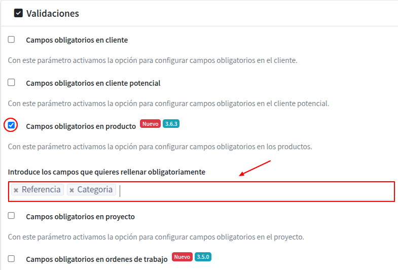- Buscar el bloque Validaciones y activar la casilla Campos obligatorios en producto.