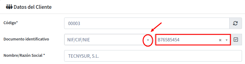 En el campo Documento identificativo, deberás seleccionar la opción 02 (NIF/CIF/NIE) e introducir el número correspondiente del cliente.