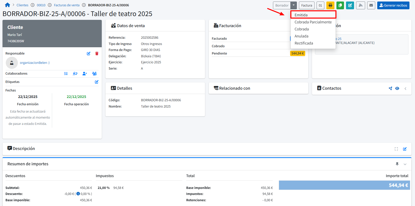 - Cambia de estado la factura a Emitida.