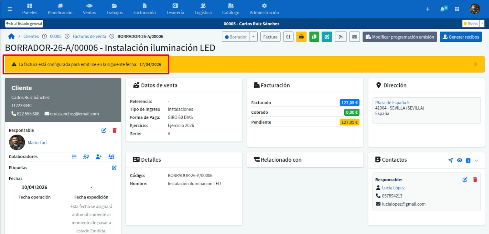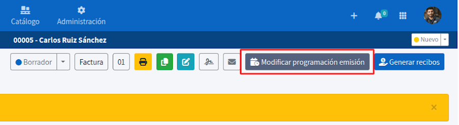 Una vez programada, aparecerá inmediatamente un aviso en color amarillo dentro de la factura indicando el día en que se emitirá.