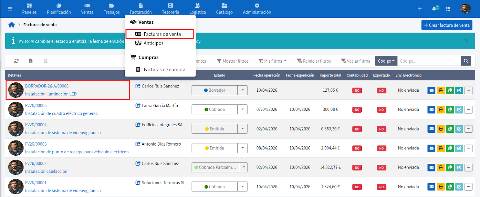 1. Accede a la factura en borrador haciendo clic en el menú superior en Facturación y selecciona Facturas de venta. A continuación, busca la factura que deseas programar y haz clic en ella para acceder a su visualización.