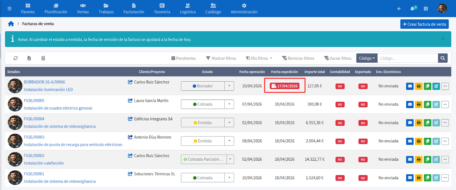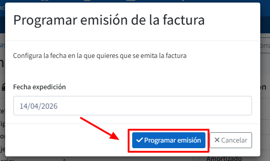 Además, en el listado general de facturas, verás un recuadro rojo con la fecha de emisión programada para identificarla rápidamente.
