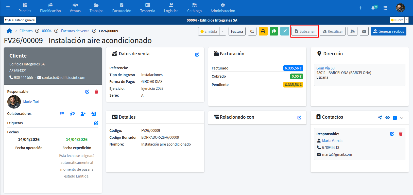 *La función de subsanar está diseñada exclusivamente para modificar datos que no tengan repercusión fiscal. Si necesitas cambiar un campo bloqueado (en gris), deberás emitir una Factura Rectificativa.
