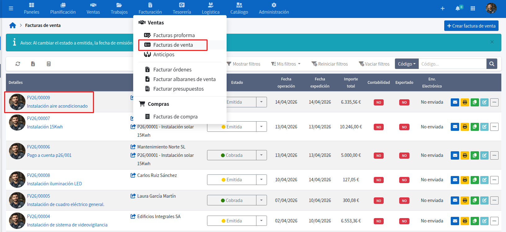 - Selecciona Facturas de venta y busca en el listado la factura que deseas corregir.
