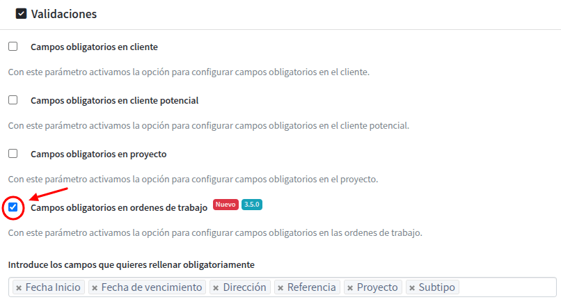 - Buscar el bloque Validaciones y activar la casilla Campos obligatorios en órdenes de trabajo.